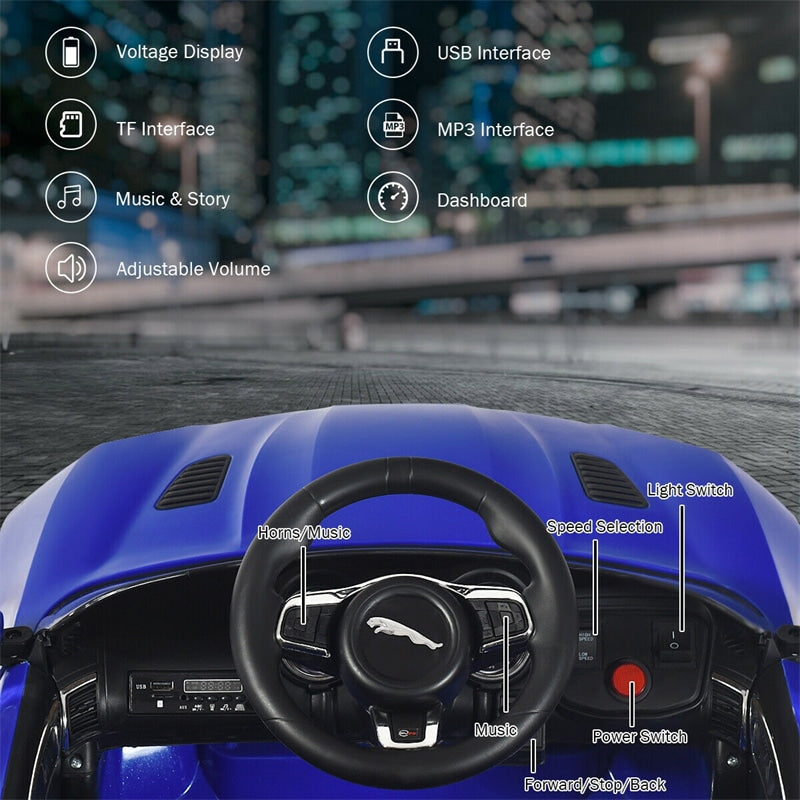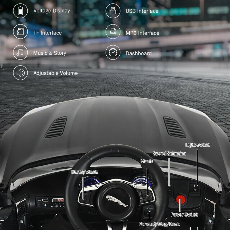 Have?this Jaguar Kids Car Journey?to let your kids start an adventurous journey,?bringing your kids?a real driving experience with lights, rearview mirrors, horns, and 2 lockable doors. 2.4G parental remote control design, forward and backward functions with free speed adjustment are realistic and safe. The wear-resistant wheels effectively absorb shock and move smoothly on various roads. With this Jaguar Kids Car Journey, let your kids start an adventurous journey!