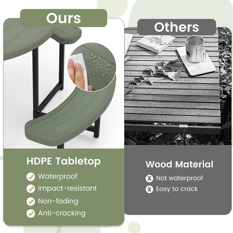 All-Weather HDPE Tabletop: Made from high-quality HDPE material, both the tabletop and the bench surface are resistant to cracking and fading, offering long-lasting durability. Plus, the low-maintenance design ensures minimal effort to keep the picnic table & bench set looking great.