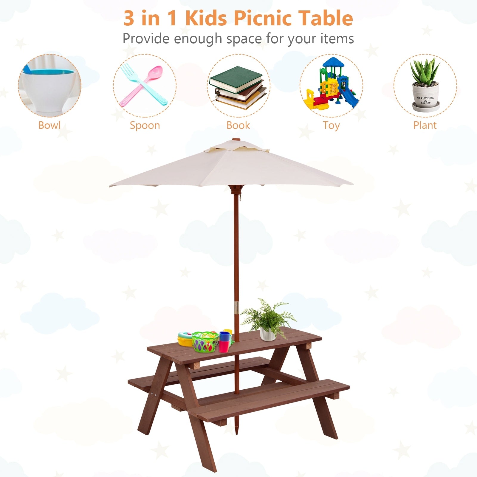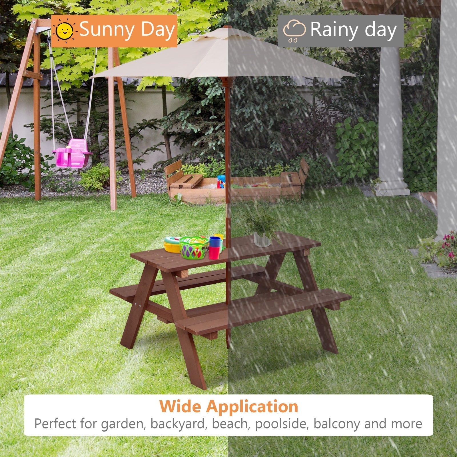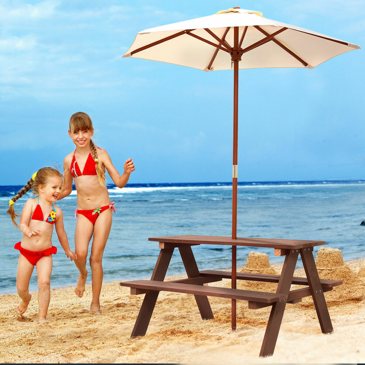 This kids' picnic table & bench set can be used as a play table or picnic table. Four children can sit comfortably for social play and interaction. Coming with a removable and foldable umbrella, this picnic table is perfect for your kids to enjoy their meals or snacks outdoors in a shaded place. Give your child a comfortable space of their own in your backyard to eat, play and relax with the wooden kids' outdoor picnic table & bench set.